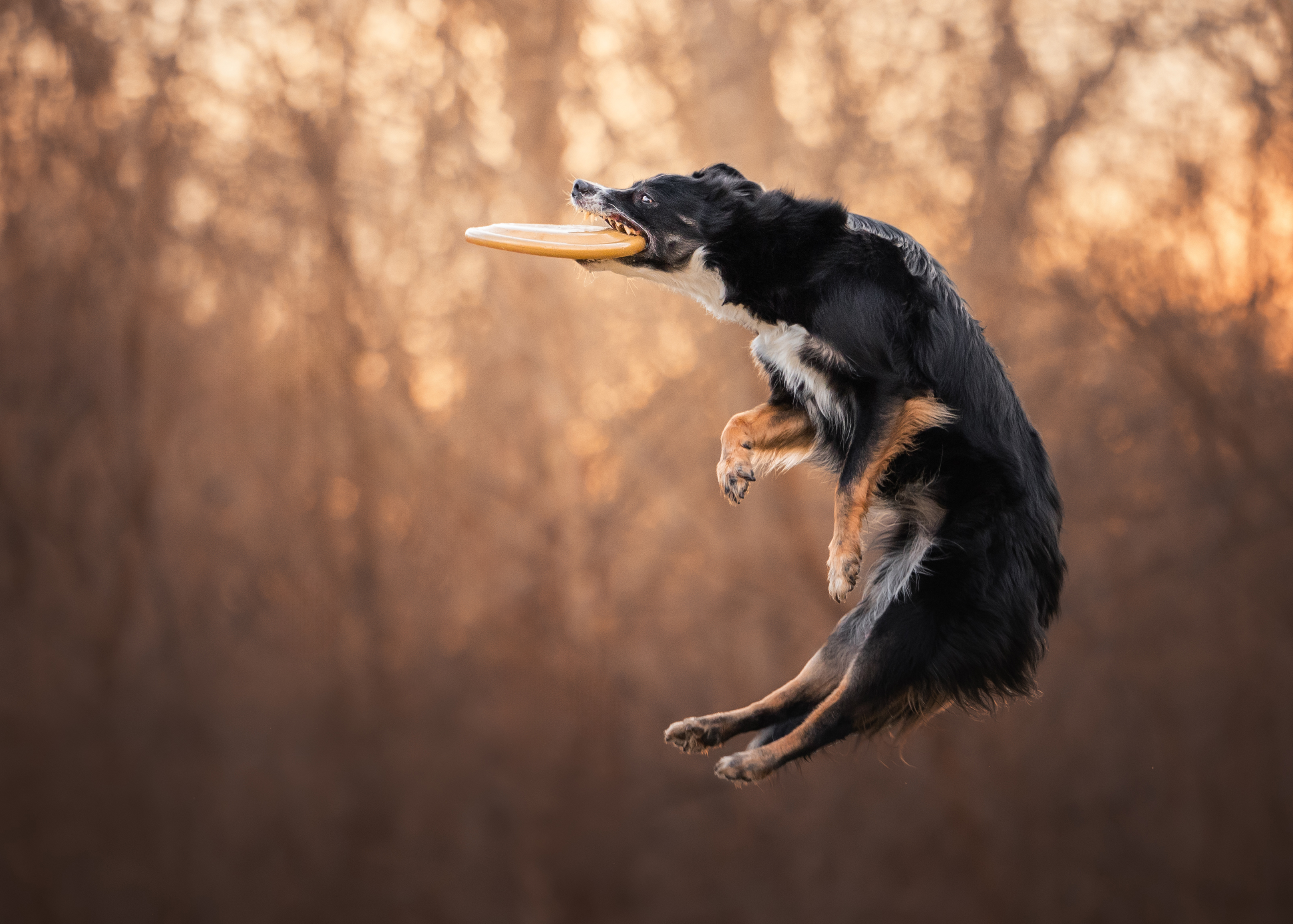 Stardust, the Border Collie, leaping up catching a disc for her owner.